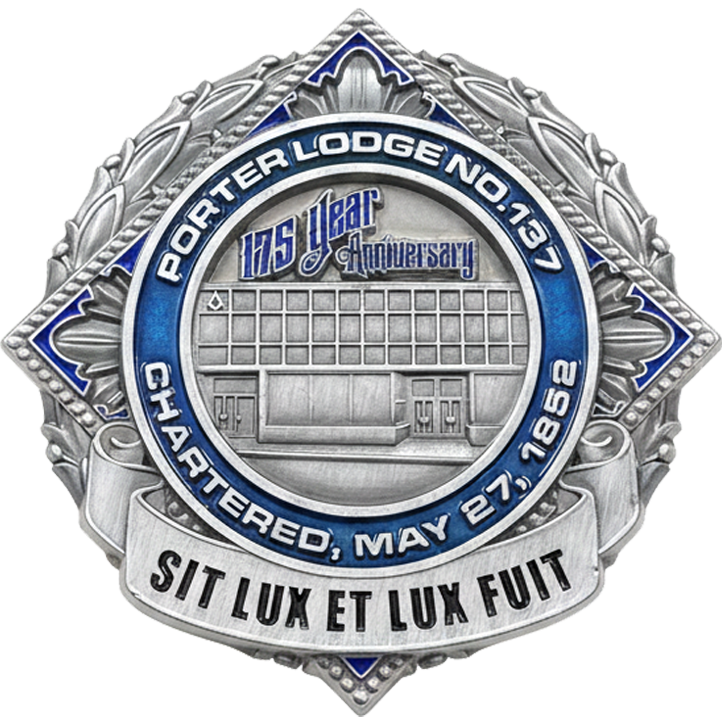 In honor of our 175th anniversary, we are proud to offer a limited-edition Commemorative Rededication Coin. The face of the coin depicts the Lodge building as of 2026, while the obverse displays a view to the East of our Lodge room interior.